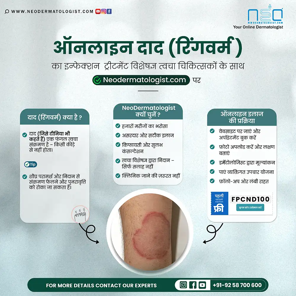 अधिक जानेक्या आप ऑनलाइन त्वचा विशेषज्ञ या पास के किसी स्किन स्पेशलिस्ट की तलाश में हैं? तो विज़िट करें NeoDermatologist.com - आपका विश्वसनीय प्लेटफ़ॉर्म, जहाँ आपको त्वचा और बालों से जुड़ी एक्सपर्ट कंसल्टेशन कभी भी और कहीं भी मिल सकती है। चाहे आपको ऑनलाइन डर्मेटोलॉजिस्ट कंसल्टेशन चाहिए, मुंहासों का इलाज किसी सर्टिफ़ाइड त्वचा विशेषज्ञ से करवाना हो, या फिर दाद (रिंगवर्म) और हेयर डॉक्टर की सलाह लेनी हो - यहाँ सब उपलब्ध है।NeoDermatologist.com वैश्विक स्तर पर सेवा प्रदान करता है, जिससे आप दुनिया के किसी भी कोने से अनुभवी और प्रमाणित त्वचा विशेषज्ञों से जुड़ सकते हैं। फोटो या वीडियो कंसल्टेशन जैसी लचीली सेवाएँ और तेज़ रिस्पॉन्स सिस्टम आपको इंतज़ार से बचाता है और सही इलाज जल्दी दिलाता है। तो अगर आप “मेरे पास त्वचा विशेषज्ञ” खोज रहे हैं, तो याद रखें कि NeoDermatologist.com के साथ आप कहीं से भी, कभी भी, ग्लोबल ऑनलाइन डर्मेटोलॉजिस्ट कंसल्टेशन का लाभ उठा सकते हैं - और पा सकते हैं भरोसेमंद स्किन केयर सीधे अपनी स्क्रीन पर।